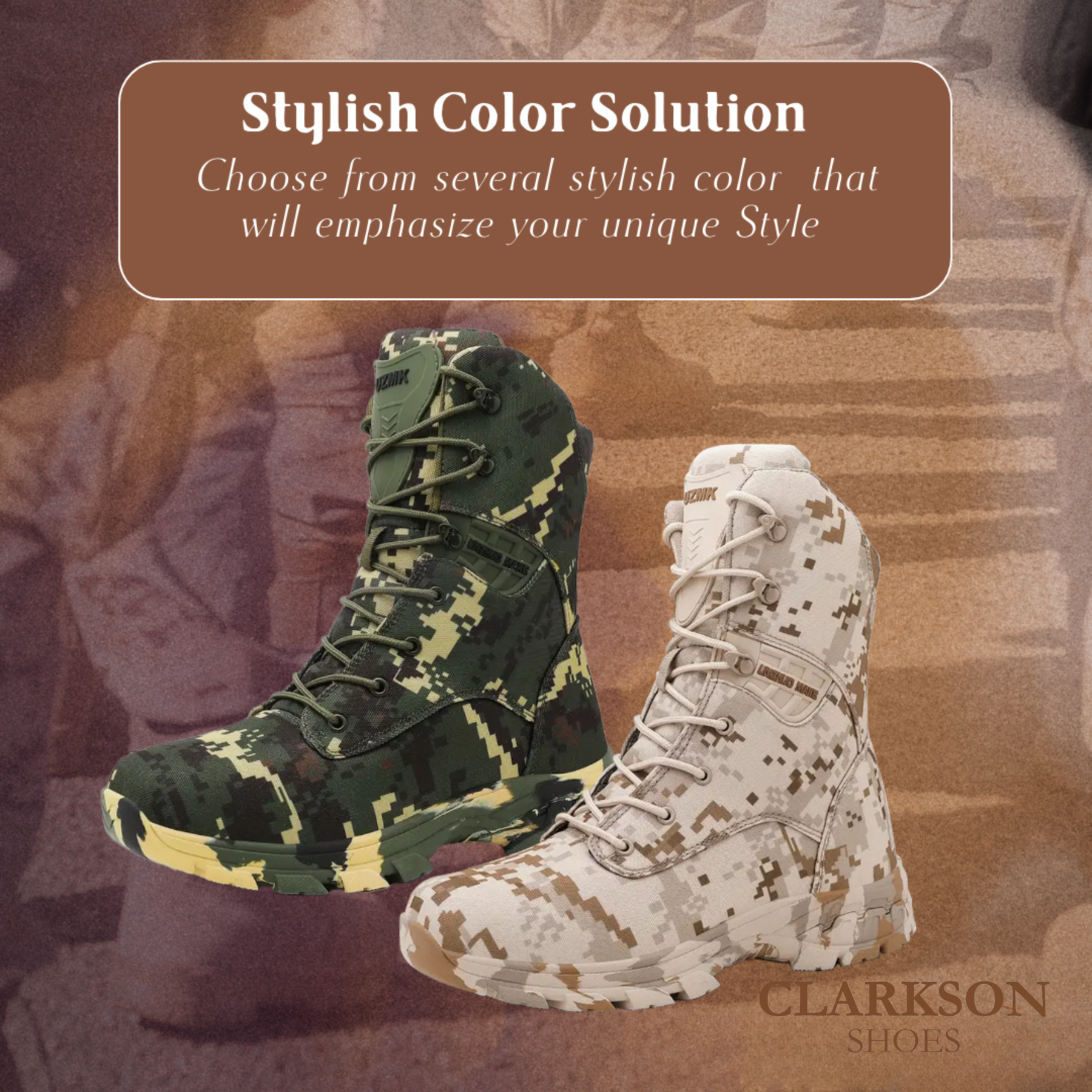 Zack boots are designed for the man who demands durability and performance without compromising on style. Crafted to handle the toughest outdoor challenges, these high-top camouflage military boots offer superior protection, comfort, and grip for hiking, climbing, work, or any adventure that calls for reliable footwear. With a striking camouflage pattern and practical features, Zack boots ensure you stay ready and confident in all seasons.